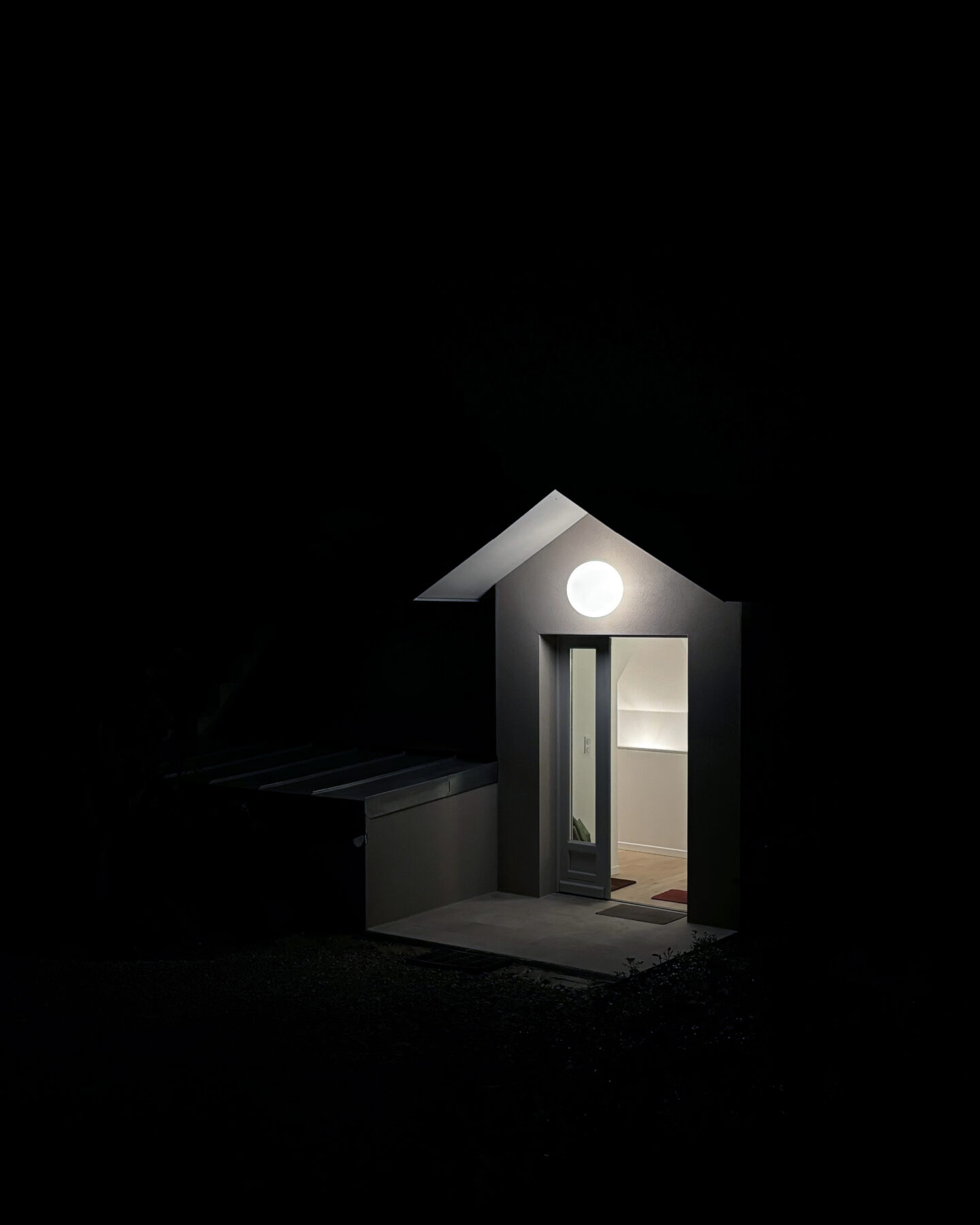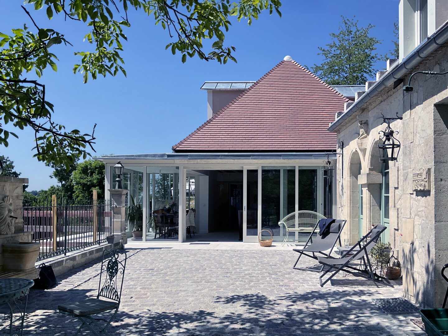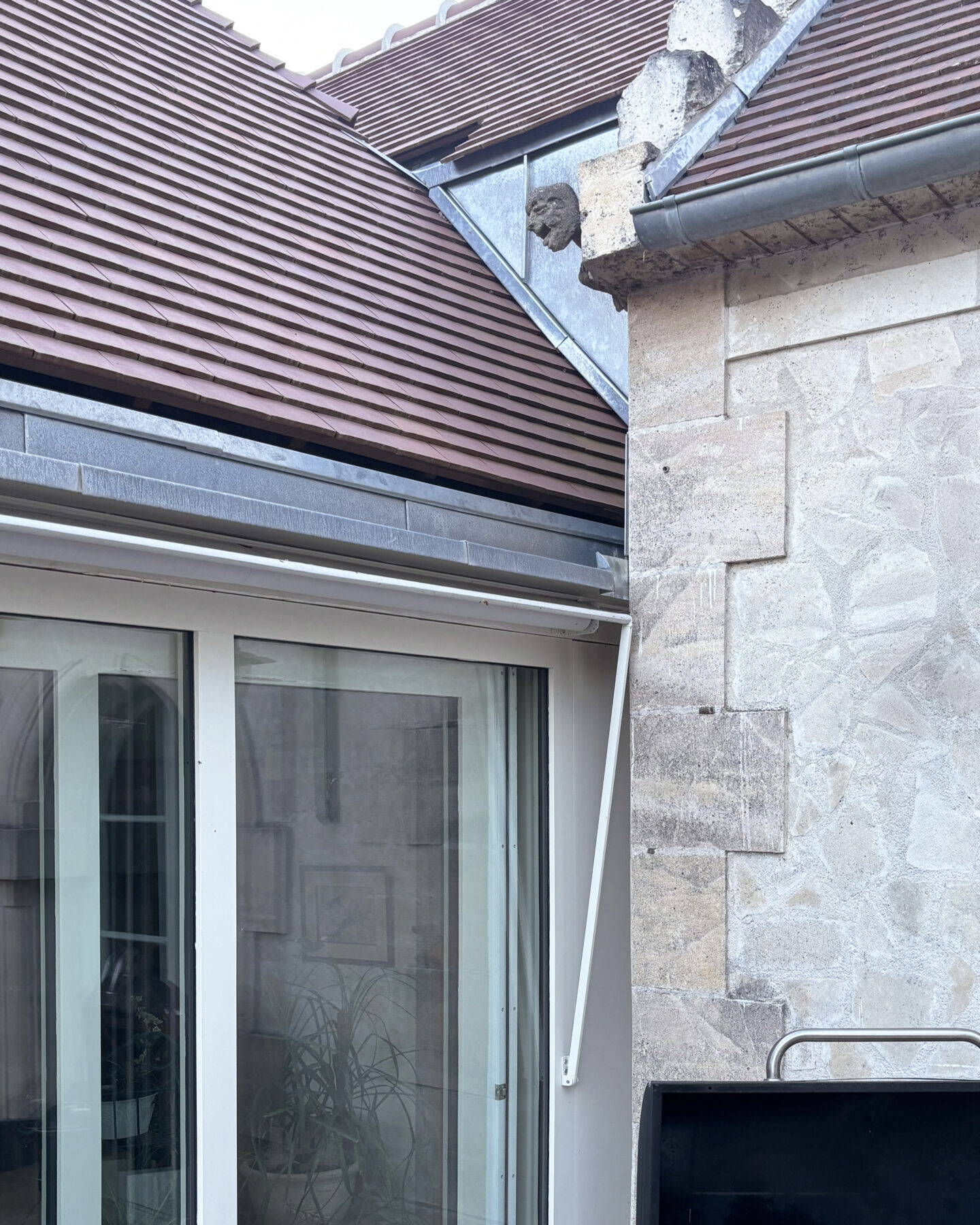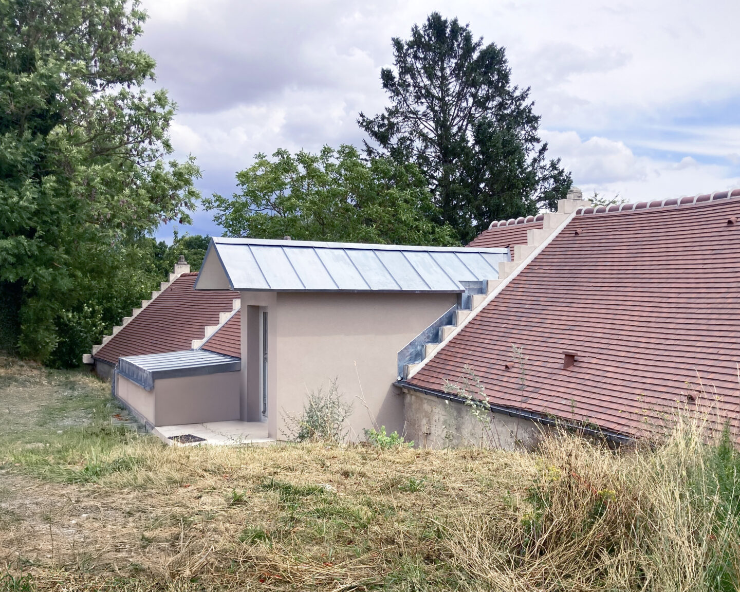 La forme de l’élément rapporté résulte du prolongement des deux faitages adjacents traversée par la nouvelle entrée de la maison reliant ainsi les jardins hauts et bas de la propriété.